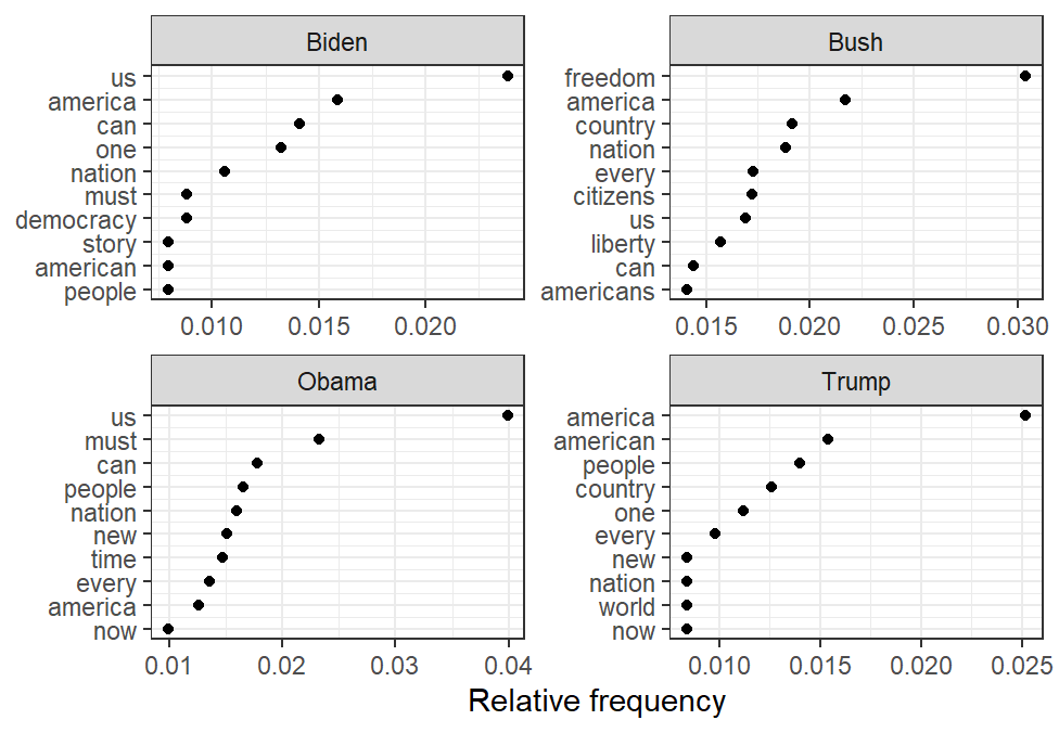 These words can then be graphed by their frequency, as seen for the previous four administrations below.