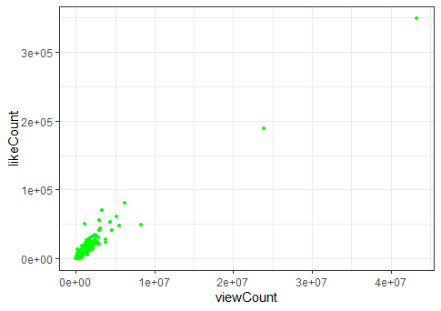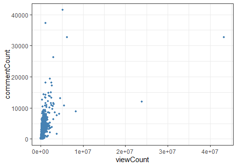 There are two broad conclusions from the data. Firstly, as expected, videos with more views get more likes and comments. Additionally, the majority of videos have low videos, likes, and comment values, with only a few having high numbers of all. This is also consistent with the expected idea that most videos are not viral.